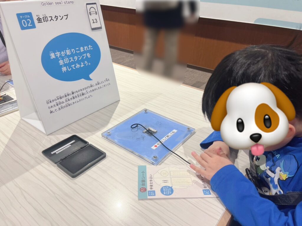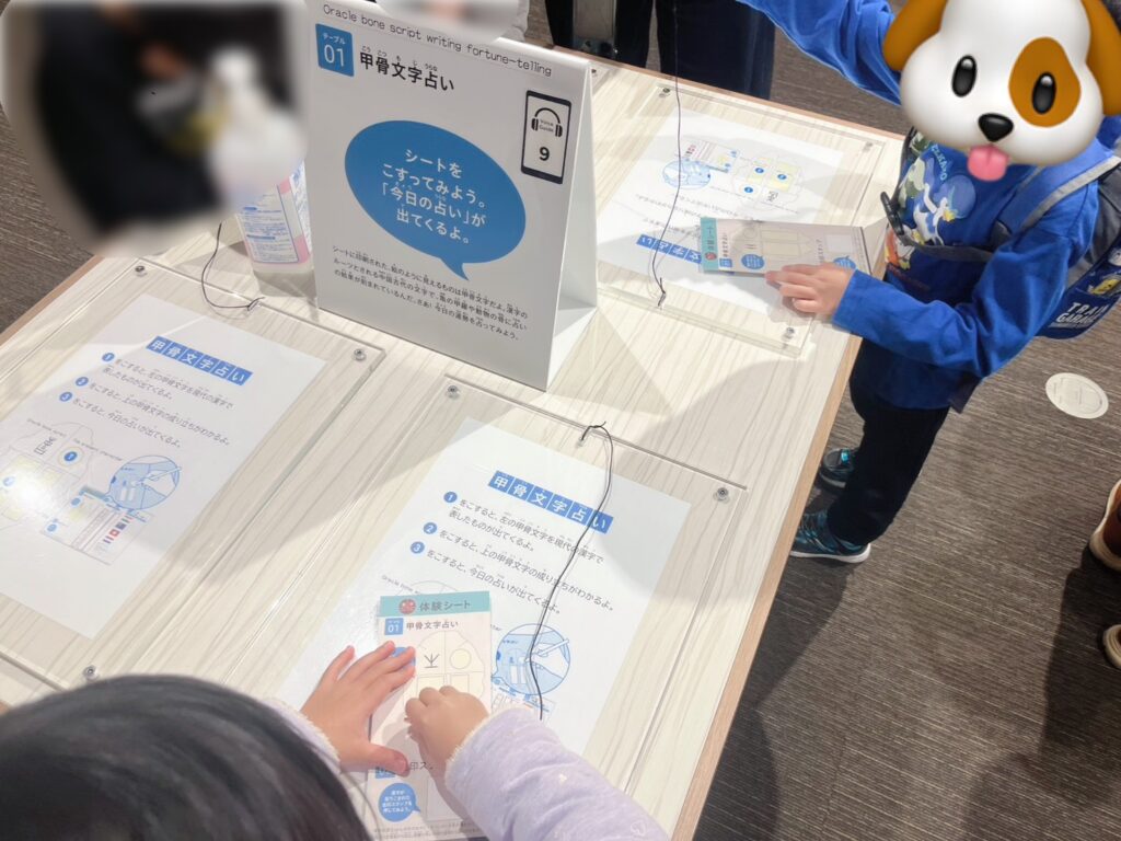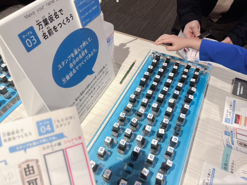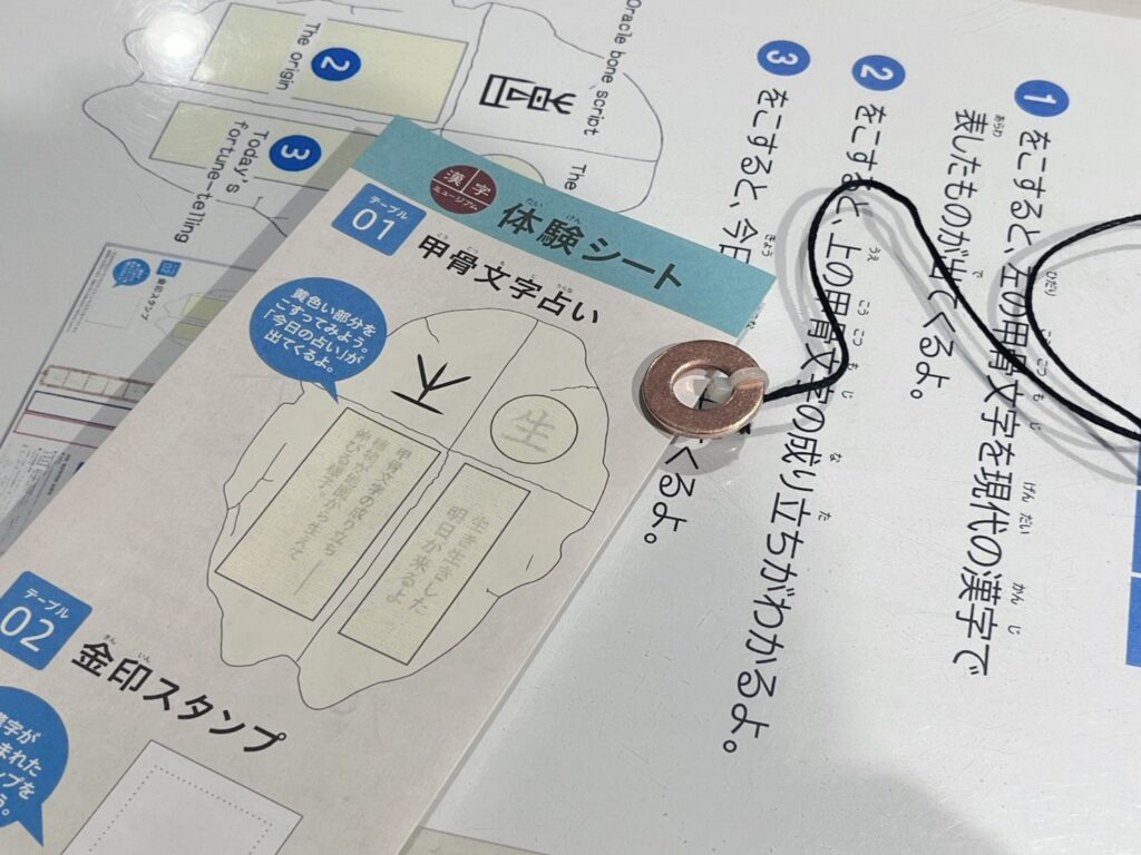 1〜5までのテーブルで「甲骨文字占い」や「金印スタンプ」「万葉仮名で名前をつくろう」など